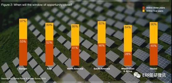 判斷轉(zhuǎn)型的速度是一個關(guān)鍵的挑戰(zhàn)。改革的時機和重點都因世界各地的當(dāng)?shù)厥袌龆悺T谝恍┦袌?,集中化發(fā)電的經(jīng)濟效益已經(jīng)受到重創(chuàng),上游和下游都受到了沖擊。在其他市場,變革的重點通常是下游??v觀各地區(qū),為能源轉(zhuǎn)型的窗口期在歐洲關(guān)閉得最快,在中東和非洲關(guān)閉得最慢。但即便是在中東和非洲,絕大多數(shù)國家也認(rèn)為,關(guān)鍵時刻只剩下5年時間。這也是全球行業(yè)從業(yè)者的共識。