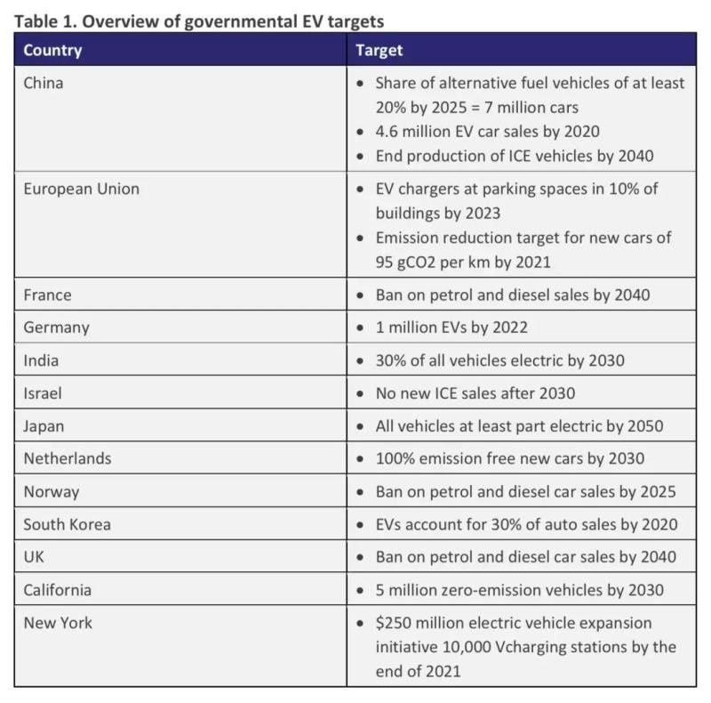 根據(jù)英國E3G機(jī)構(gòu)匯總的數(shù)據(jù),目前各國、地區(qū)設(shè)立的新能源(電動)汽車發(fā)展目標(biāo)如下: