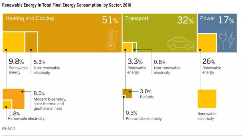 根據(jù)REN21匯總的數(shù)據(jù),在全球范圍內(nèi)2016年供熱(冷)占全球能耗的51%,在供熱(冷)能耗中可再生能源僅9.8%(現(xiàn)代生物質(zhì)、太陽能、地?zé)岬?.0%,可再生能源電力占1.8%)。同年全球交通能耗占總能耗的32%,交通能耗只有3.3%來自可再生能源(3.0%生物燃油、0.3%可再生能源電力)。而在發(fā)電領(lǐng)域,可再生能源發(fā)電占比已經(jīng)達(dá)到26%。