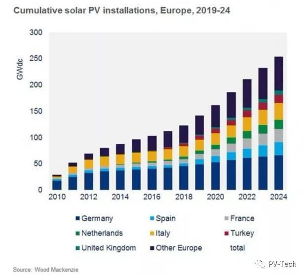 Wood Mackenzie預(yù)計,德國仍是無可爭議的歐洲光伏領(lǐng)袖。2019年至2024年,德國計劃開發(fā)20GW項目,之后一年,累計裝機量會超過65MW。