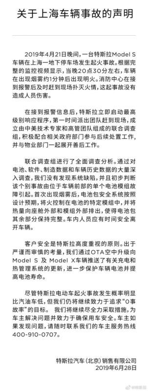 面對車主和社會對自燃事故的質疑,6月28日下午,特斯拉汽車(北京)銷售有限公司公布《關于上海車輛事故的聲明》,對在今年4月21日發(fā)生在上海地下車庫的特斯拉電動汽車自燃事故,作出回應。