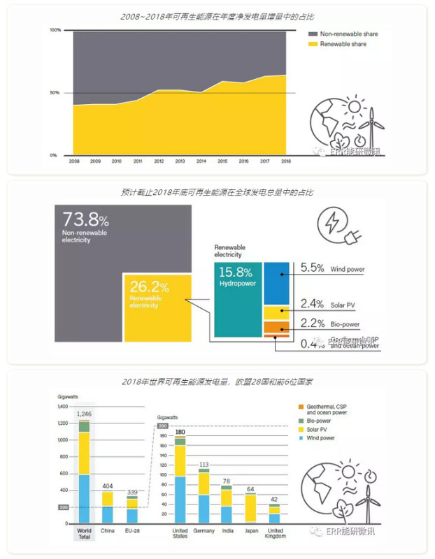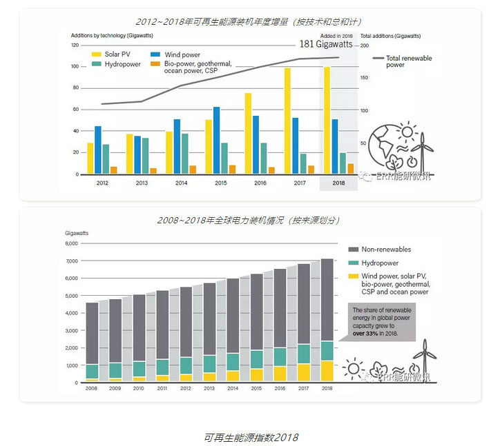 可再生能源的地位已在全球范圍確立。2018年,90多個(gè)國(guó)家安裝了至少1吉瓦的可再生能源裝機(jī),而至少有30個(gè)國(guó)家/地區(qū)的可再生能源裝機(jī)超過(guò)10吉瓦。風(fēng)能和太陽(yáng)能光伏發(fā)電在一些地方的市場(chǎng)份額進(jìn)一步增加,目前越來(lái)越多的國(guó)家在電力結(jié)構(gòu)中擁有超過(guò)20%的間歇性可再生能源。