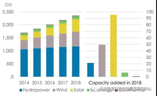 圖1 2014-2018年全球可再生能源裝機(jī)量變化態(tài)勢(shì)(單位:GW)