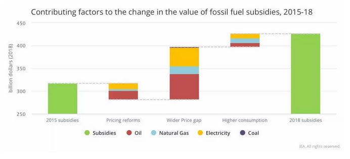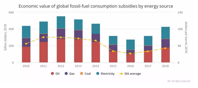 根據(jù)國際能源署(IEA)匯總的數(shù)據(jù),2018年全球化石能源補(bǔ)貼高達(dá)4270億美元,其中石油行業(yè)補(bǔ)貼1820億美元、天然氣行業(yè)990億美元、電力行業(yè)1430億美元。