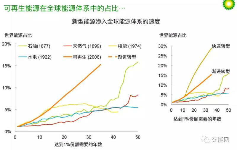 ● 在漸進轉(zhuǎn)型情景下,可再生能源占比從1%增長到10%需要約25年。這比歷史上任何能源的滲透速度都快