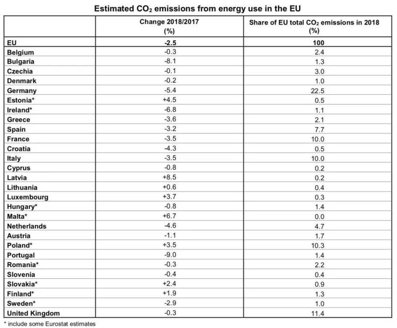 2018年歐盟成員國的二氧化碳排放量下降最多的國家是:葡萄牙(-9.0%)、保加利亞(-8.1%)、愛爾蘭(-6.8%)、德國(-5.4%)、荷蘭(-4.6%)、克羅地亞(-4.3%)。二氧化碳排放增加的國家是:拉脫維亞(+8.5%)、馬耳他(+ 6.7%)、愛沙尼亞(+4.5%)、盧森堡(+3.7%)、波蘭(+3.5%)、斯洛伐克(+2.4%)、芬蘭(+1.9%)和立陶宛(+0.6%)。