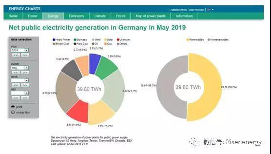 根據(jù)弗勞恩霍夫太陽能系統(tǒng)研究所ISE的數(shù)據(jù),2019年5月德國電力結(jié)構(gòu)中可再生能源的份額達(dá)到了50.7%,而一年前這一比例為48.4%。
