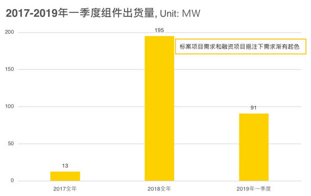 2019年一季度的組件出貨量已達到91MW,其組件需求可能有部分是用于去年10月份完成的標(biāo)案項目以及其他受到海外融資的項目需求。