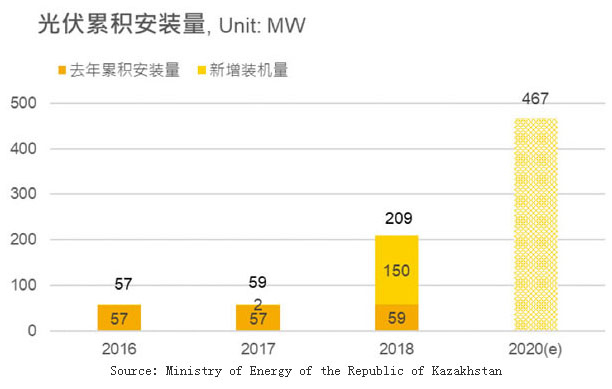近年國際金融機構(gòu)(EBRD, CTF, ADB等)開始挹注資金到哈薩克斯坦協(xié)助建造光伏項目,也使得政府開始重拾發(fā)展光伏的動力,裝機需求也開始浮現(xiàn),截至2018年年底的累積安裝量已達到209MW,其中新增裝機量為150MW,是歷年來最高。