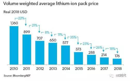 電池價格將一直處在下降通道中,2018年P(guān)ACK級別的價格為176美元/kWh,到2025年將降到87美元/kWh,到2030年再降至62美元/kWh。