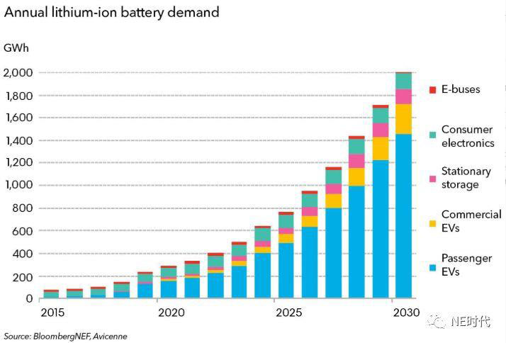 BNEF預(yù)測,到2030年電動汽車對鋰電池的需求量將快速增長,超過1,748GWh。