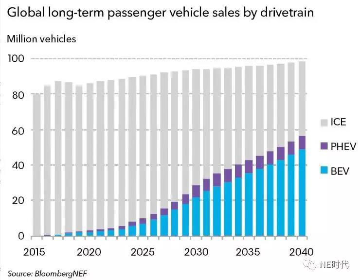 2018年全球電動汽車銷量超200萬輛,而在2010年才不過幾千輛。BNEF預(yù)測,到2025年電動汽車銷量將漲到1000萬輛,2030年2800萬輛,2040年5600萬輛。
