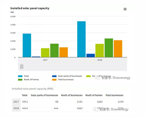 根據(jù)荷蘭中央統(tǒng)計局(CBS,Centraal Bureau voor de Statistiek)的數(shù)據(jù),荷蘭的太陽能裝機(jī)容量在2018年增加了1,500至4,414兆瓦,相比2017年增加了50%以上。其中包括2.3GW的個人屋頂光伏系統(tǒng)裝機(jī)量、0.44GW的大型太陽能電站,以及1.66GW的工商業(yè)屋頂電站系統(tǒng)。