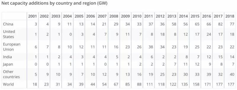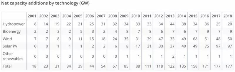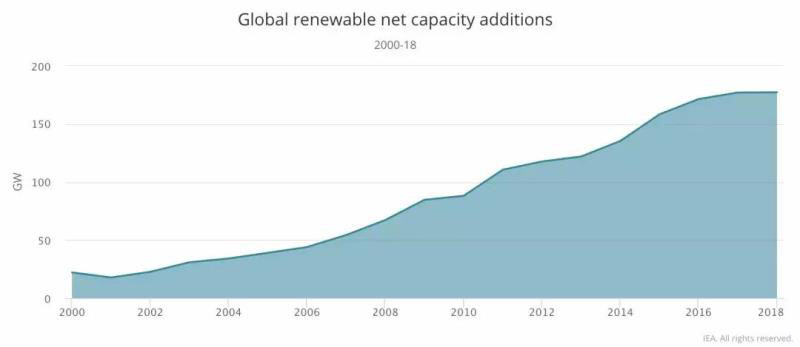 全球可再生能源發(fā)電裝機(jī)容量自2001年以來(lái)快速增長(zhǎng),至2017年每年新增裝機(jī)均超過(guò)上一年。但是,2018年全球新增可再生能源裝機(jī)177吉瓦,與2017年新增裝機(jī)持平,顯示全球可再生能源發(fā)電裝機(jī)的增長(zhǎng)趨勢(shì)已經(jīng)放緩。