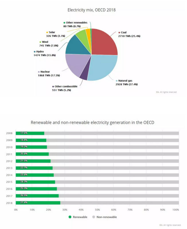 根據(jù)國際能源署最新數(shù)據(jù),2018年經合組織36個成員國的發(fā)電結構中天然氣比例最高,達到27.4%,其次是煤電(25.4%)、核電(17.5%)、水電(13.8%)、風電(7.0%)、太陽能(3.1%)、其他燃料電源(5.2%)、其他可再生能源(0.7%)??傮w而言,2018年經合組織國家的可再生能源比例為27.4%,比2008年增長9.8個百分點;化石能源電源比例為52.8%。