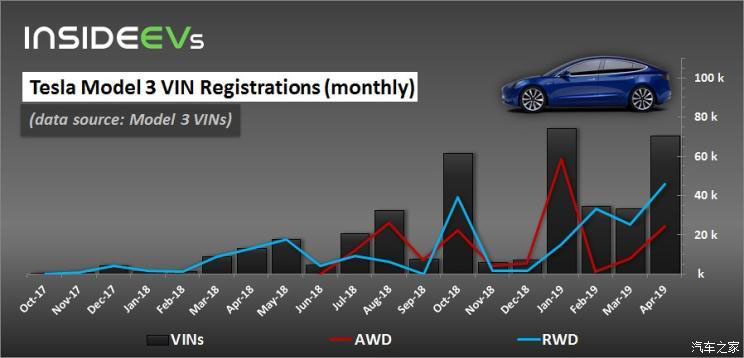 其中,特斯拉Model 3(參數(shù)|詢價(jià))依然是貢獻(xiàn)最大的車型,截止到4月29日,該車型的累計(jì)注冊(cè)數(shù)量超過(guò)4萬(wàn)輛,達(dá)到40732輛;特斯拉總注冊(cè)量達(dá)70880輛,其中北美地區(qū)為最大交付地區(qū),以37754輛占比53.3%,除北美以外的國(guó)際地區(qū)交付量達(dá)33126輛,占比46.7%。就四月份而言,后輪驅(qū)動(dòng)相比四驅(qū)車型來(lái)說(shuō)更具吸引力,其中后輪驅(qū)動(dòng)車型交付量達(dá)46403輛,占比65.5%。