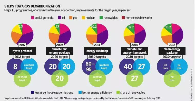 2014年,歐盟通過了2030年氣候與能源框架,制定了到2030年實現(xiàn)溫室氣體減排40%、可再生能源在能源領(lǐng)域占比達(dá)到27%、能源效率至少提高27%的目標(biāo)。即便如此,實現(xiàn)了這些目標(biāo)也無法實現(xiàn)巴黎協(xié)定中的把全球變暖控制在2攝氏度內(nèi)的目標(biāo)。