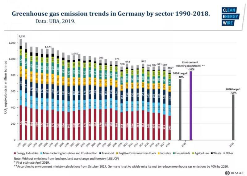德國政府的減排目標是到2030年排放量比1990年減少至少55%。2018年德國的排放量比1990年低約30.6%。德國環(huán)境部長Svenja Schulze表示,德國2018年碳排放下降受益于這一年溫暖的冬季和陽光明媚的天氣,這增加了可再生能源的生產(chǎn),減少了對取暖燃料的需求。