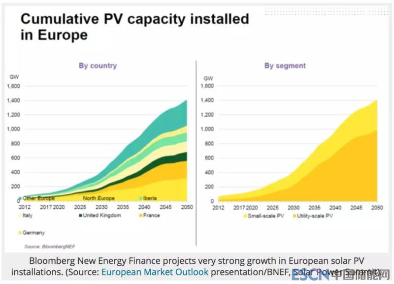 GTM Research預(yù)計,到2022年歐洲每年將安裝10至17吉瓦的電力,使累計容量達(dá)到182吉瓦。彭博社預(yù)計到2050年歐洲裝機(jī)容量將增加到1,400吉瓦。到2050年,太陽能將成為歐洲最大的發(fā)電來源,其占總消費量的比例從2018年的約5%增加到2050年的36%。重新樂觀的主要推動力是歐盟國家制定的目標(biāo)。2030年將非洲大陸的溫室氣體排放量減少40%,2050年減少80%。大多數(shù)觀察家預(yù)計歐盟將在今年晚些時候制定更加雄心勃勃的目標(biāo)。