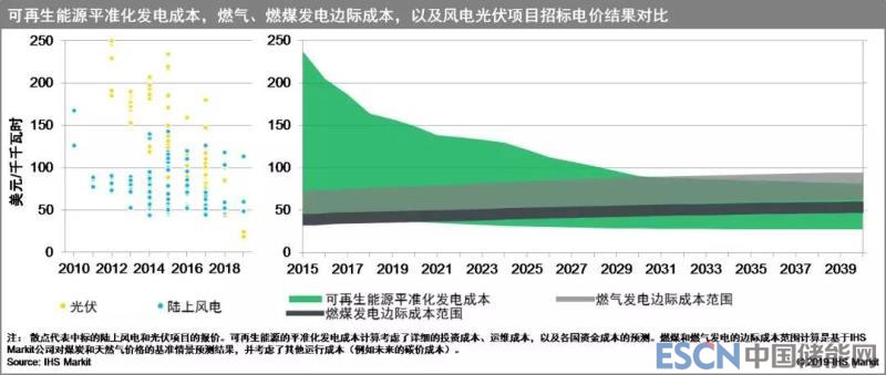 IHS Markit預(yù)測,到2050年,電站規(guī)模的光伏發(fā)電、陸上風(fēng)電和海上風(fēng)電價(jià)格將分別下降55%、34%和51%,這將使不同技術(shù)的發(fā)電成本在全球范圍逐漸接近,并加劇不同技術(shù)之間的競爭。