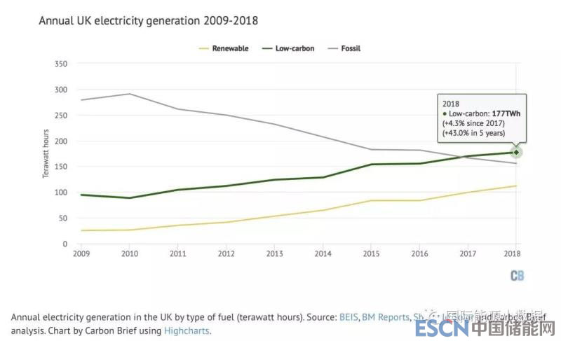 與此同時,2018年可再生能源的產量再次創(chuàng)下歷史新高,2018年占英國總產量的33.4%(風電17.4%、生物質10.7%、太陽能3.8%、水電1.5%)。包括核電(19.4%)在內,2018年低碳能源占英國發(fā)電量的52.8%,來自化石的份額燃料處于歷史最低點(天然氣39.4%、煤電5.1%、其他2.8%)。