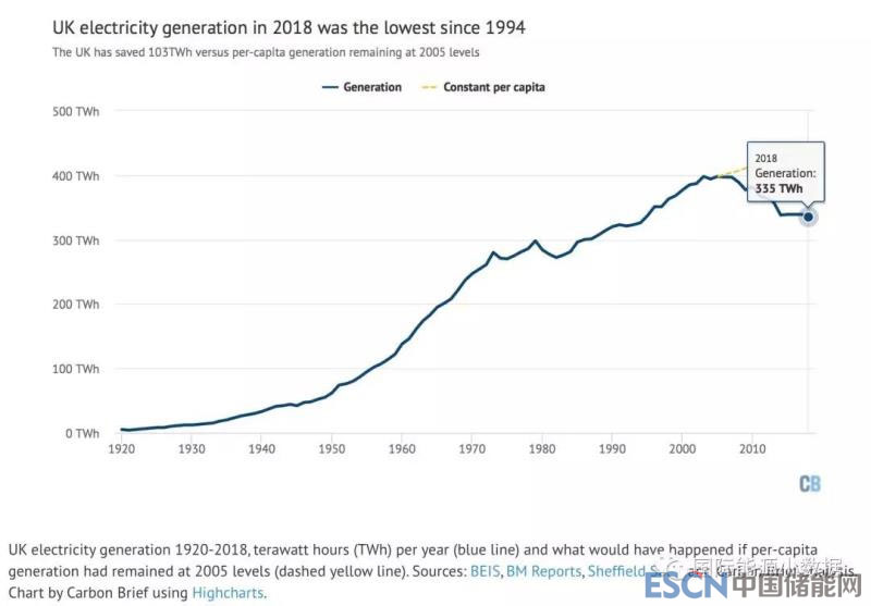 中國儲能網訊:根據Carbon Brief匯總的數據,由于需求的下降,2005年英國發(fā)電量達峰以后連年下降,2018年英國發(fā)電總量約為3350億千瓦時(335TWh),是25年來的最低水平,相當于回到1994年(326TWh)。