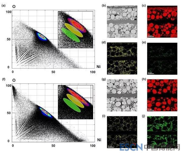 同時,接助電子探針對不同顆粒進行元素分析,按照不同濃度層級Ni-O區(qū)分,依次按紅、黃、綠遞減,從圖6中觀察發(fā)現(xiàn),經(jīng)過500次循環(huán)后,圖6(h)中紅色標記的原始顆粒區(qū)域包含了大部分大顆粒但不是小的NCM二次粒子。另外,低濃度區(qū)域(黃色,6(i))不僅包圍了大的NCM二次粒子的表面,而且包圍了部分的小NCM顆粒。其余大部分為小NCM顆粒。Ni-O濃度最低(綠色,圖6(j))。因此,過渡金屬元素溶解優(yōu)先發(fā)生在破碎/粉碎的大顆粒和小顆粒。