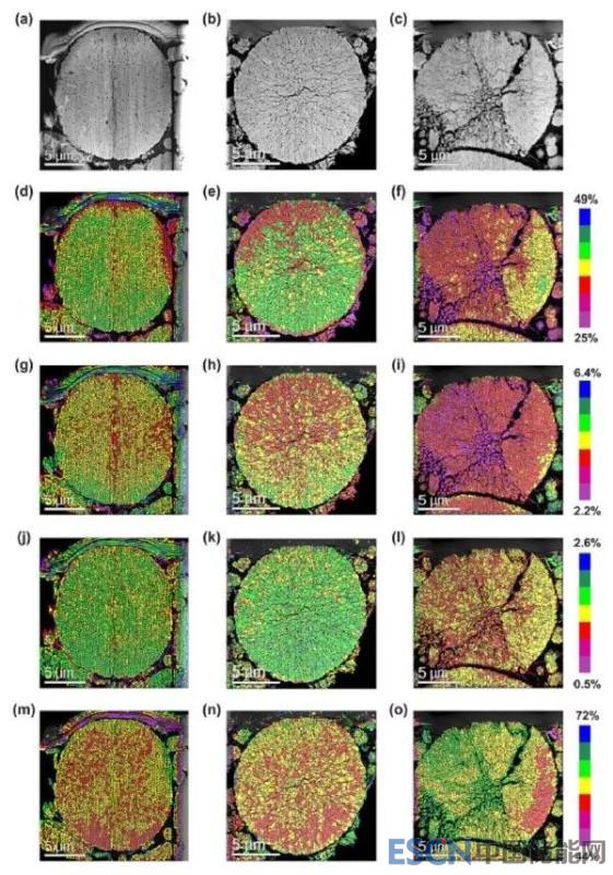 圖5 原始態(tài)、裂化(500循環(huán)后)和破碎(500循環(huán)后)顆粒(a-c) STEM-HAADF圖像及其切片的(d-f) Ni, (g-i) Co,(j-l) Mn,(m-o) O的元素分布組成圖