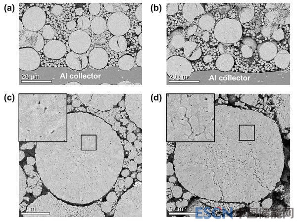 圖4 (a)、(c)為原始態(tài)和(b)、(d)為500循環(huán)NCM正極材料的橫斷面SEM圖像。(c)、(d)分別為(a)、(d)的放大圖