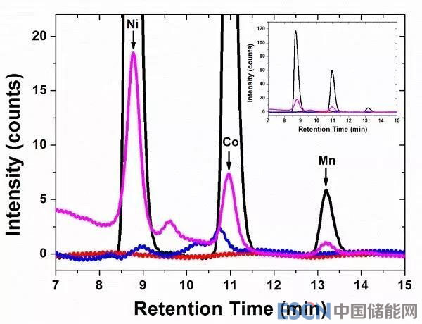 圖3 溶解的正極NCM的離子色譜圖(基準線,黑線)經(jīng)過0次(紅線)、2次(藍線)和500(紫色線)次循環(huán)后電解液。插圖表示全譜縮放色譜圖。
