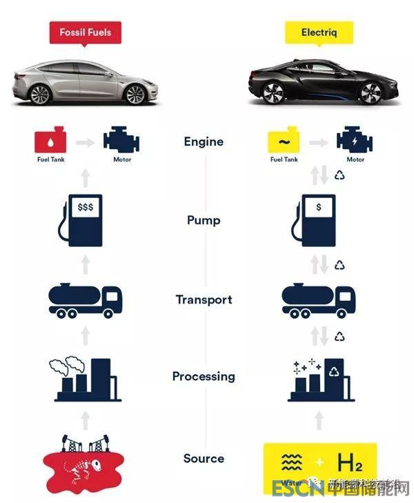 Electriq~Global系統(tǒng)包含三個(gè)關(guān)鍵元素:液體燃料(Electriq~Fuel),它與催化劑(Electriq~Switch)發(fā)生反應(yīng),按需釋放氫氣,然后將乏燃料捕獲并帶回工廠,在那里用氫和水進(jìn)行再循環(huán)使用(Electriq~Recycling)。