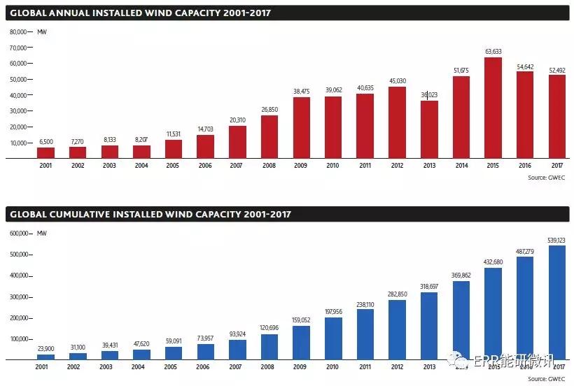 中國儲能網(wǎng)訊:2018年4月25日,全球風能理事會發(fā)布《全球風電報告2017》。17年,全球風電新增裝機容量保持50GW以上,歐洲、印度和離岸部門實現(xiàn)了歷史性增長。中國新增風電裝機容量有所回落,即19.66GW,為全球新增裝機容量的不到一半。2017年全球新增裝機容量為52,492MW,累計裝機容量達到539,123MW。與2016年新增裝機容量(54,642MW)相比,同比下滑3.8%;累計裝機容量與2016年底(487,279MW)相比增長11%。