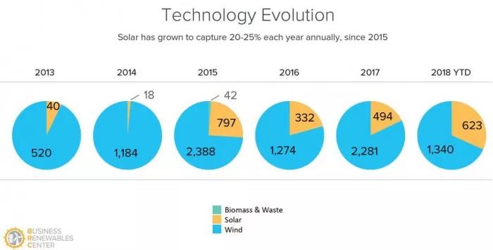 但至少有一些美國企業(yè)仍在推動可持續(xù)能源。商業(yè)可再生能源中心的數(shù)據(jù)顯示,2018年可再生能源交易的速度將超過2017年公布交易中的2.78GW電量。今年到目前為止,他們已經(jīng)簽約了1.96吉瓦,如果持續(xù)表示今年的可再生能源交易在可能會超過2015年3.12GW的峰值。