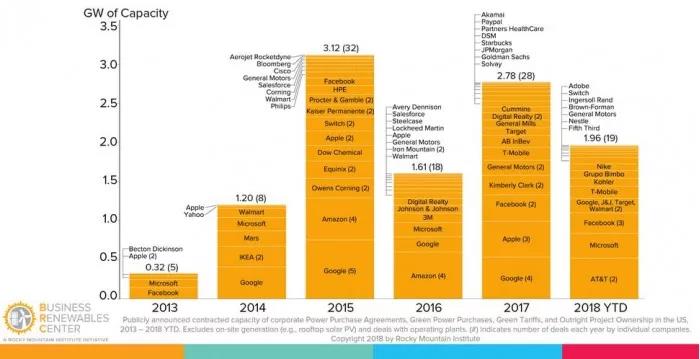 從2008年到2013年,只有四家公司簽署了可再生能源的交易:谷歌、蘋果、沃爾瑪和環(huán)保產(chǎn)品制造商SCJohnson。然而,從2013年到2018年,還有51家公司加入了這一趨勢。包括亞馬遜、Facebook、微軟、T-Mobile和AT&T在內(nèi)的科技公司緊隨谷歌和蘋果的步伐。