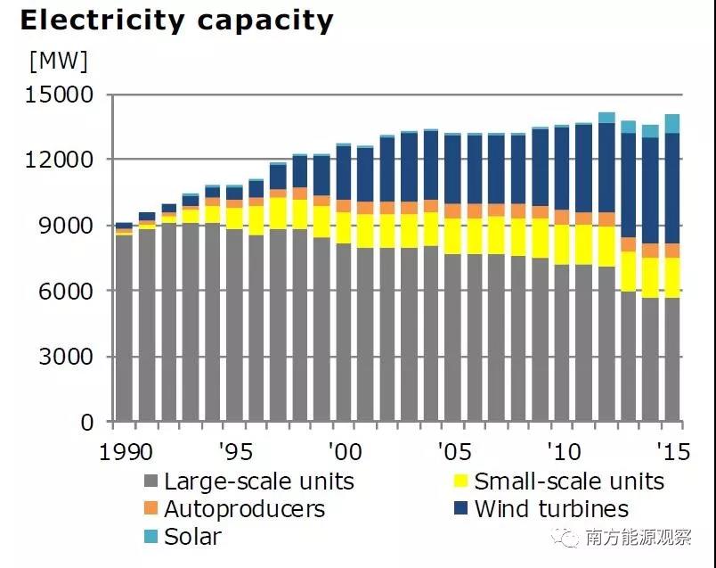 2015年,丹麥全年生產(chǎn)電量的48%來自風(fēng)電,風(fēng)電的裝機(jī)容量達(dá)到了全部裝機(jī)容量的36%,剩余裝機(jī)除少部分來自太陽(yáng)能發(fā)電和水電外大部分依靠熱電(包括煤電、天然氣發(fā)電、生物質(zhì)發(fā)電等),而這部分熱電的79.1%實(shí)現(xiàn)了熱電聯(lián)產(chǎn)。
