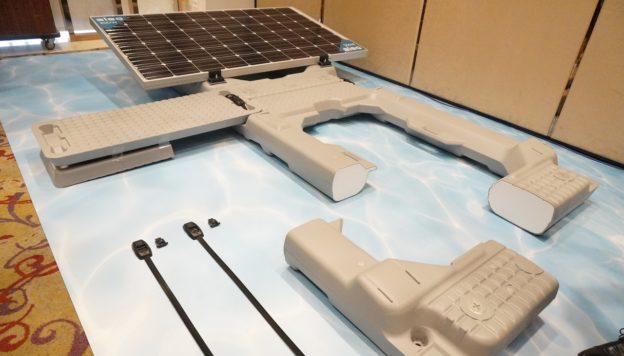 產(chǎn)品全名為“水上太陽光浮體系統(tǒng)”,正在申請專利中的主要設(shè)備包括:浮體(放置太陽能電池板)、垂直支架(支撐浮體)、橋梁(維修通道)、束帶(固定浮體)、膨脹螺栓、太陽光面板固定零件,基本上能對應(yīng)各家廠商的太陽能面板。