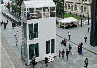 隨著世界各地城市房屋擁擠日趨嚴(yán)重,有些人認(rèn)為把住房面積縮小會(huì)是一個(gè)解決方案。圖為Tikku被搬到赫爾辛基街頭,供行人參觀體驗(yàn)。