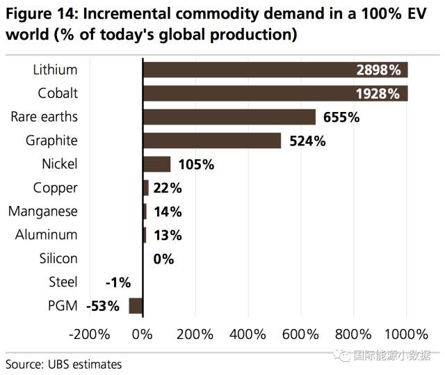 如果電動(dòng)汽車(chē)的市場(chǎng)份額達(dá)到100%,那么全球大宗商品的需求變化如下所示: