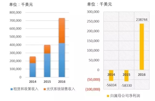 據(jù)SolarCity公布財報數(shù)據(jù),2016年公司實(shí)現(xiàn)營業(yè)收入7.30億美元,同比增長82.76%。其中來自光伏系統(tǒng)租賃和政策收入占總收入比重過半,為4.22億美元,同比增長43.87%;來自光伏系統(tǒng)和組件的銷售收入為3.08億美元,較2015年將近翻了一番。