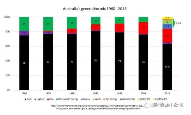 中國儲能網(wǎng)訊:根據(jù)澳大利亞政府環(huán)境和能源部的統(tǒng)計數(shù)字,2016年澳大利亞的發(fā)電量中仍有62.9%來自煤電,18.5%天然氣發(fā)電,2.3%為燃油發(fā)電,可再生能源比例為16.2%(其中6.9%水電、5%風(fēng)電、2.7%屋頂光伏)。相比之下,1960-1970年之間,澳大利亞可再生能源發(fā)電比例曾達(dá)到19%;1980年可再生能源發(fā)電比例為16%,與2016年相仿。