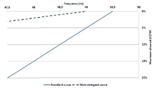 5、B.1.3.2 Active power regulation in coincidence with under-frequency transitory on the transmission grid差異:電網欠頻時滿足Figure 12bis,類似EN 50438:2013的要求。
