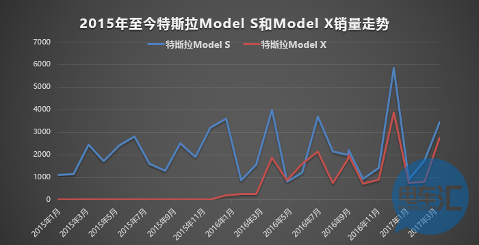 如下圖顯示,2016年3月之后,Model X市場表現(xiàn)變得強(qiáng)勁;2016年末銷量達(dá)到了峰值,月銷量接近4000。