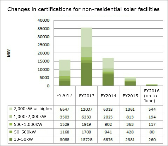 許多開發(fā)商忙于FIT計劃初期認(rèn)證的項目建設(shè),2012年至2014年度認(rèn)證的高關(guān)稅項目在市場上交易,這也導(dǎo)致了新認(rèn)證規(guī)模的下降。