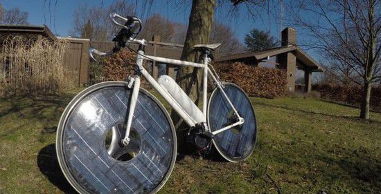 新型自行車前車輪上裝載了無刷直流電動機,車上還有一個電子節(jié)氣門控制車速和一個鉛酸電池存儲太陽能。