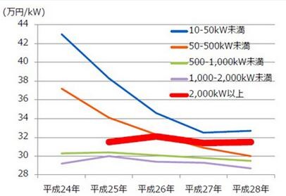 招標對象限定為并網(wǎng)輸出為2MW以上的特高壓輸電線的并網(wǎng)項目。之所以為2MW以上,是因為除了“由大規(guī)模運營商之間的競爭,有望實現(xiàn)價格降低的效果”之外,還有“從近幾年系統(tǒng)費用的走勢來看,2MW以上項目的成本壓縮停滯”等原因。