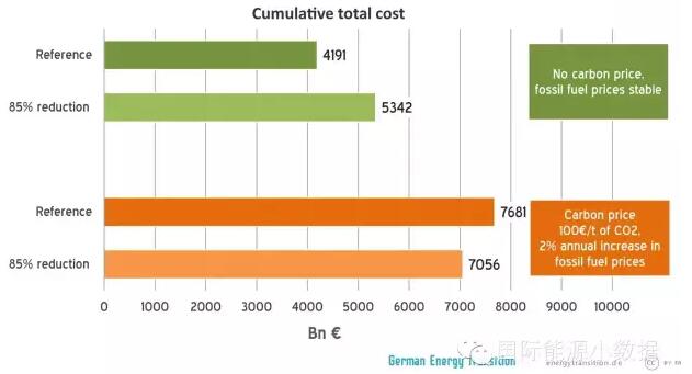 但是,上述的比較有個(gè)假設(shè):化石能源價(jià)格到2050年保持穩(wěn)定(不再增長(zhǎng)),而且不考慮碳價(jià)。如果假設(shè)化石能源價(jià)格每年上漲2%,碳價(jià)達(dá)到每噸100歐元,那么不轉(zhuǎn)型的成本就會(huì)更高。
