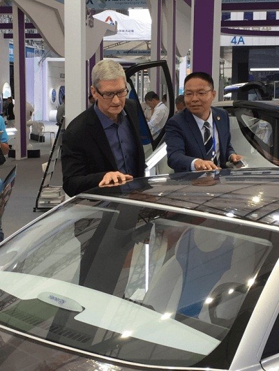 漢能控股高級副總裁張彬(右)向美國蘋果公司CEO庫克介紹漢能全太陽能動(dòng)力汽車