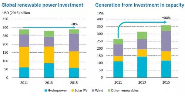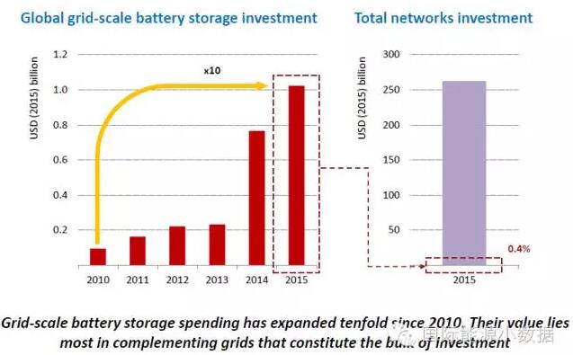 特別值得一提的是,2011年以來全球在可再生能源發(fā)電投資基本平穩(wěn),但是由于可再生能源成本的下降,每年新增的可再生能源發(fā)電量逐年增加,2015年超出2011年33%。此外,電力儲能投資2015年超過100億美元,是2010年的10倍;但是儲能投資僅占電網(wǎng)投資的0.4%,還有很長的路要走。
