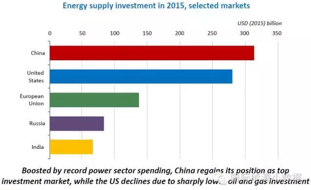 2015年中國能源領域總投資為3150億美元,占全球能源總投資的17%,是世界上第一能源投資大國,遠超位居第二的美國(2800億美元)。在中國能源投資中,有900億美元用于可再生能源發(fā)電;450億美元用于化石能源電廠(主要是煤電廠,2015年新增煤電裝機接近45吉瓦)。