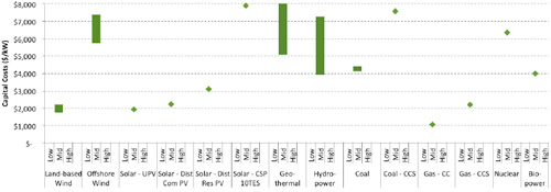 與化石燃料相比,約為天然氣聯(lián)合循環(huán)(天然氣CC)1056美元/kW的近一倍。